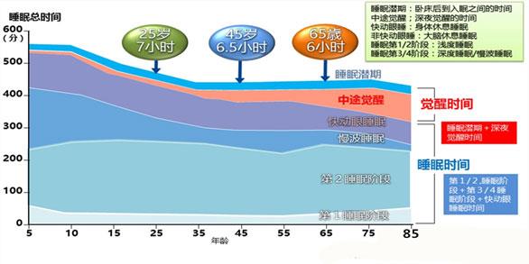 NREM期均從1期開始,1期為1~7分鐘,占總總睡眠的2~5%,這個時期易驚醒;2期持續(xù)10~25分鐘,每個循環(huán)逐漸延長,占總睡眠的45~55%,驚醒需要很大的刺激;3、4期兩期睡眠常合稱為慢波睡眠(sws)δ睡眠或者深睡眠,慢波活動占據(jù)50%以上,需要更大的刺激才能導(dǎo)致覺醒。 2,3,4期NREM期睡眠與主觀睡眠質(zhì)量有關(guān),也就是人們常說的昨晚睡得好不好。同時2,3,4期NREM期睡眠和REM期是記憶力鞏固的重要階段。 隨著年齡的增長,慢波睡眠逐漸減少,睡眠潛伏期時間延長。這也就是俗話“三十年前睡不醒,三十年后睡不著”的來源。 |